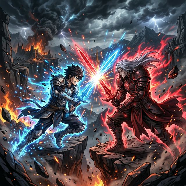 (杰作,2D 动漫风格,MAPPA 工作室美学。在一个濒临崩塌的废弃神庙中,两名武士进行的一场高燃且编排繁复的剑戟对决。动态光影,发光粒子特效,浓烈的爆发气场。当他们兵刃相交引发冲击波时,摄像机急速向后拉远。在接触的瞬间插入高对比度的黑白冲击帧。流畅的动画,鲜艳的色彩,电影级构图。)